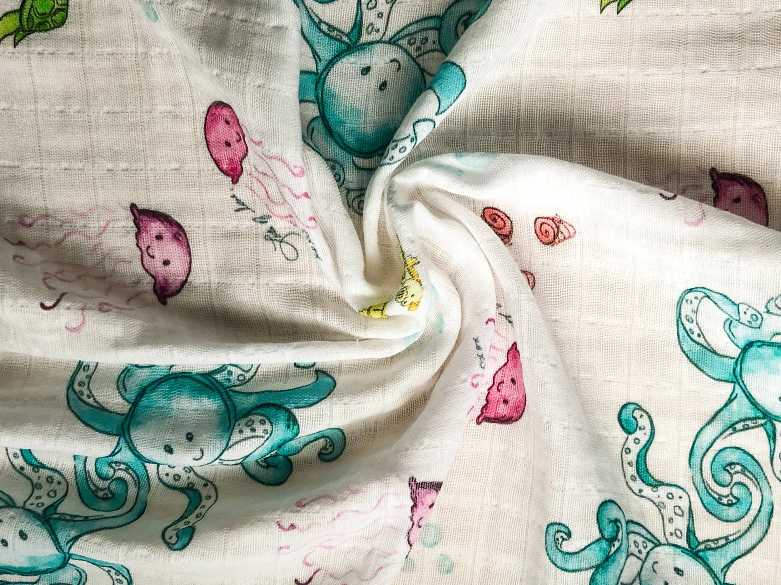 I made Kennedy a special swaddle blanket. I painted each character in watercolor to match her “under the sea” theme. I also included “Lots of Love” and “xoxo” in our Nani’s handwriting from a card I saved.